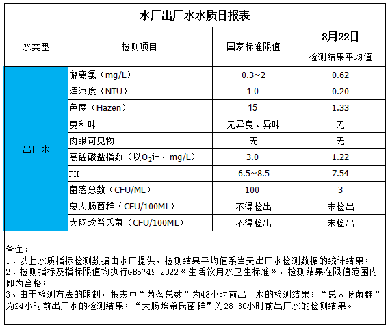 水廠出廠水水質(zhì)日?qǐng)?bào)表(2025-8-22)